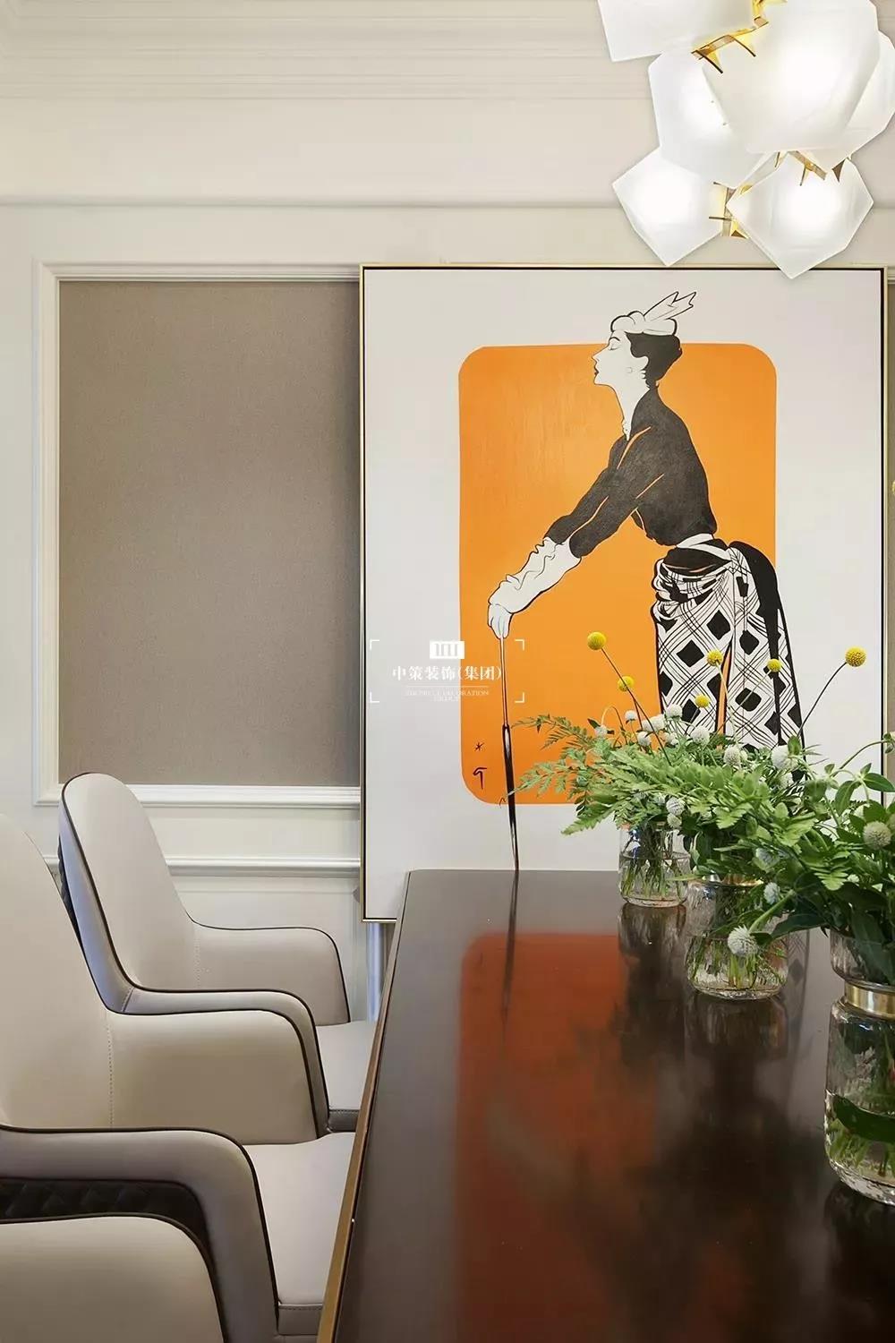 墙面局部的乳白色造型墙板搭配深灰咖墙纸,深浅对比,突显墙面质感,加以局部的装饰画,让空间有了点睛之笔。同时也增加了空间生活的层次感;相比之顶面处理就比较简单,除满足空间照明外,融入装饰性吊灯,用简单造型的石膏线条勾勒出轮廓感,与原房建筑的梁体轻重呼应;尽可能保持原有的空间感;而地面大面积选用亚光的木地板,能够让霍姐一家体验每当穿着拖鞋走在地板上的舒适脚感。