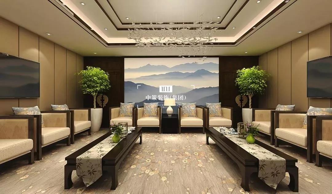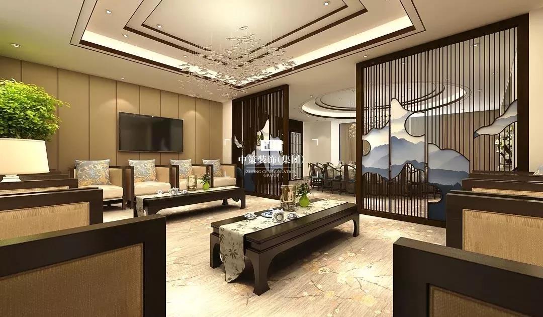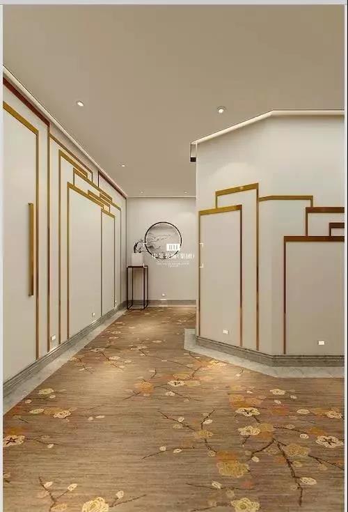 本方案是餐厅和接待厅,采用东方元素,过道的金属线条营造了一种徽派建筑高低错落的感觉。过道造型墙绵延起伏,与中式迎客松,石狮相结合,让来往的客人流连忘返。