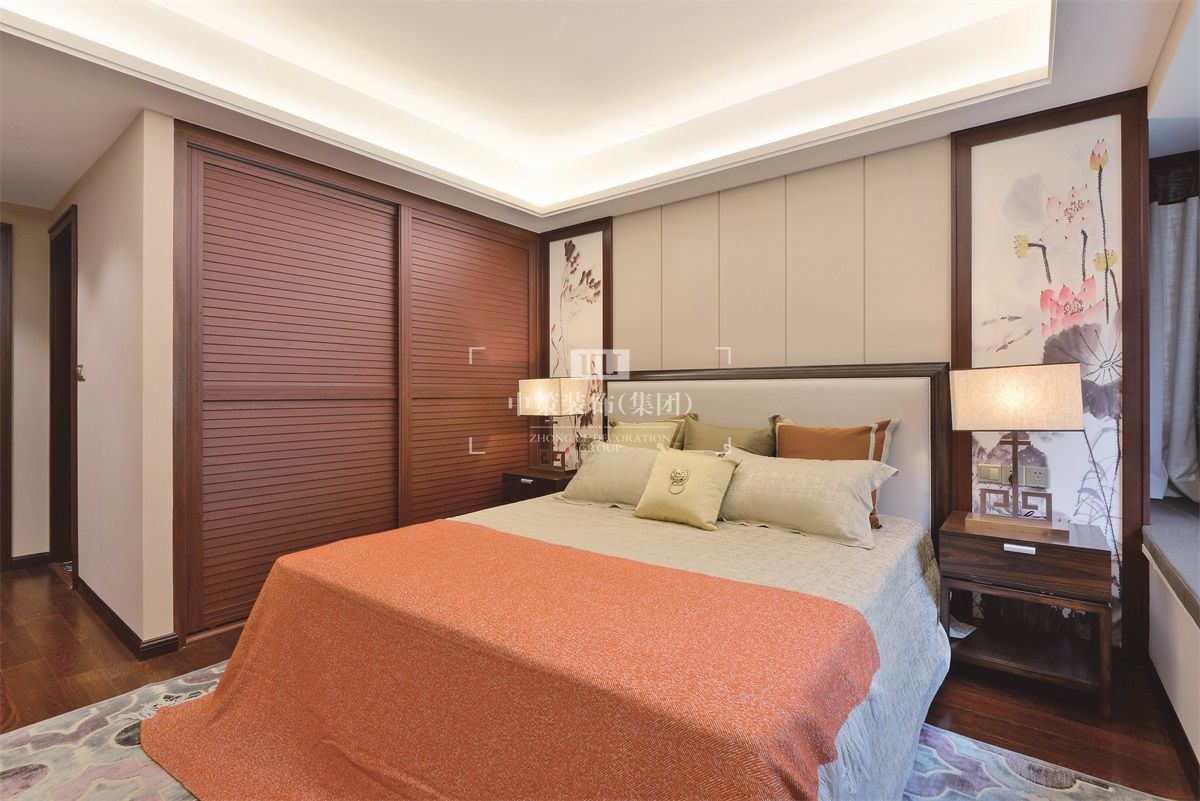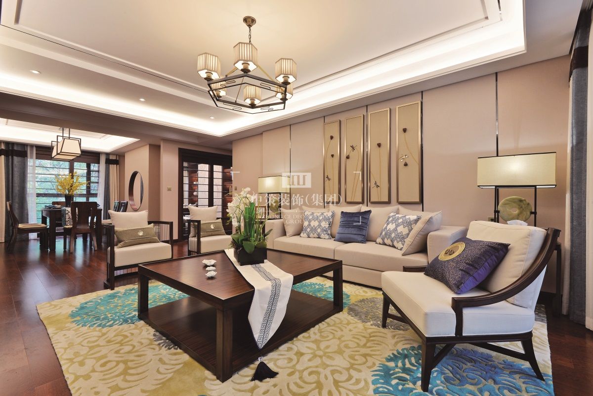 本案设计用现代手法表现新中式风格。将传统元素与现代元素有机的结合在一起,再以一些简约的造型为基础,添加了中式元素,使整体空间感觉更加丰富,大而不空、厚而不重,有格调又不显压抑。