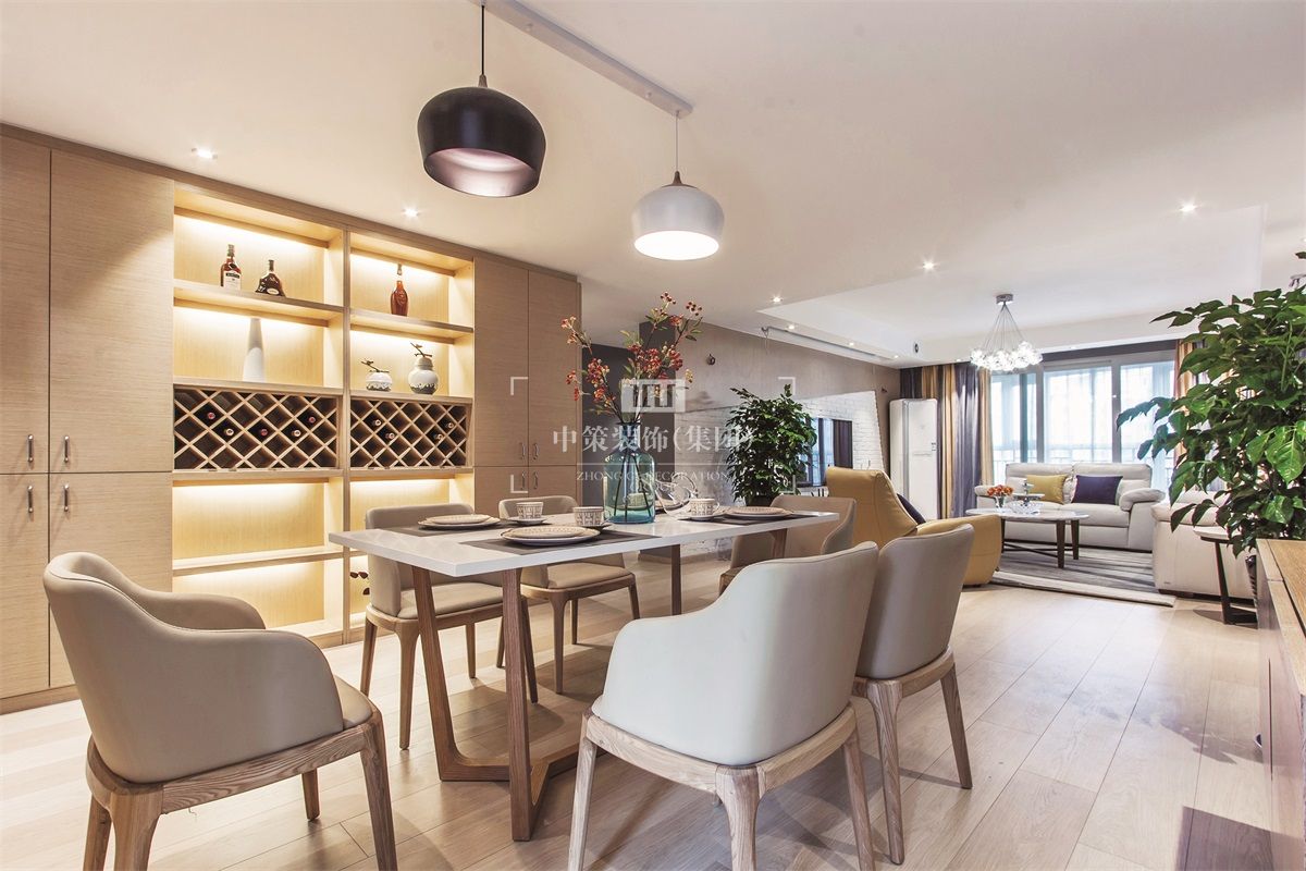 开放格局的客厅和饭厅,被过道划出独立的界域范围。饭厅更趋向于和风设计,简洁的原木色餐桌椅温暖而含蓄,搭配一旁定制的酒架橱柜,精致的感觉油然而生。饭厅旁,用一道木框玻璃推拉门隔开了两个不同的空间——厨房和生活阳台。厨房依旧延续了简约风格,定制橱柜和隔板配合,重在简单和实用。