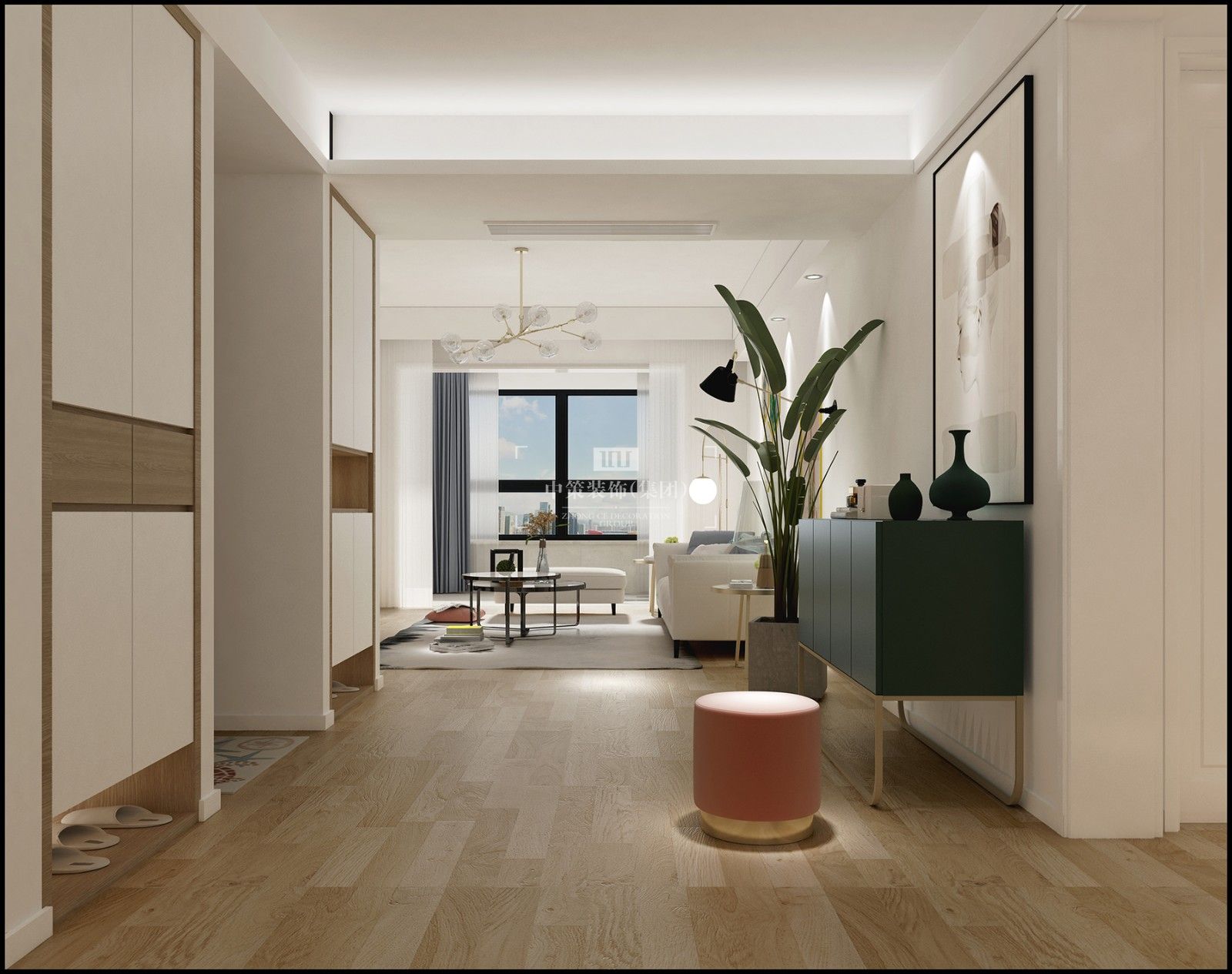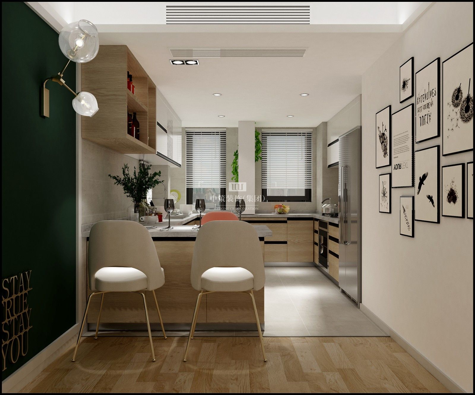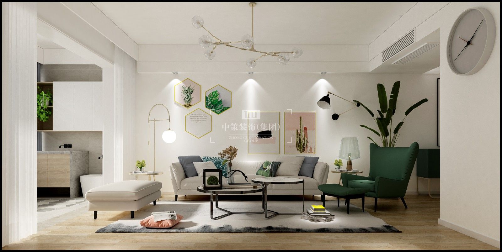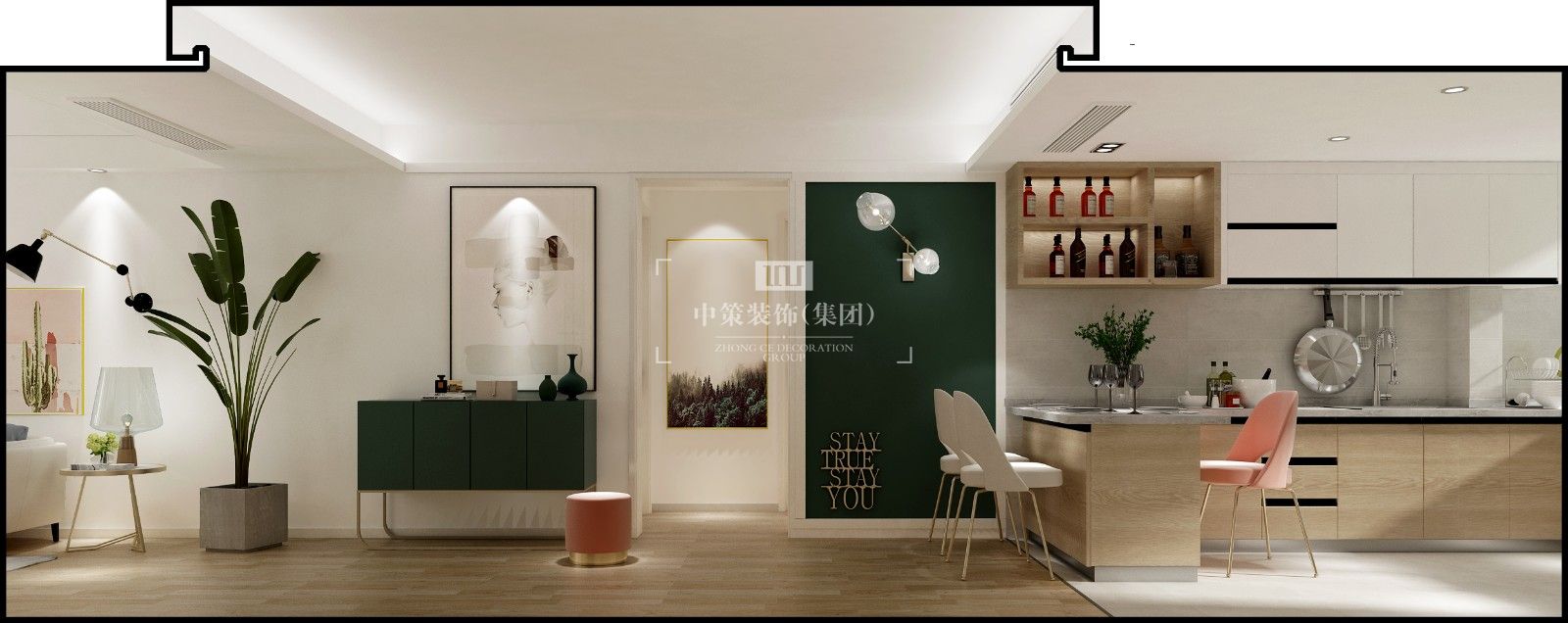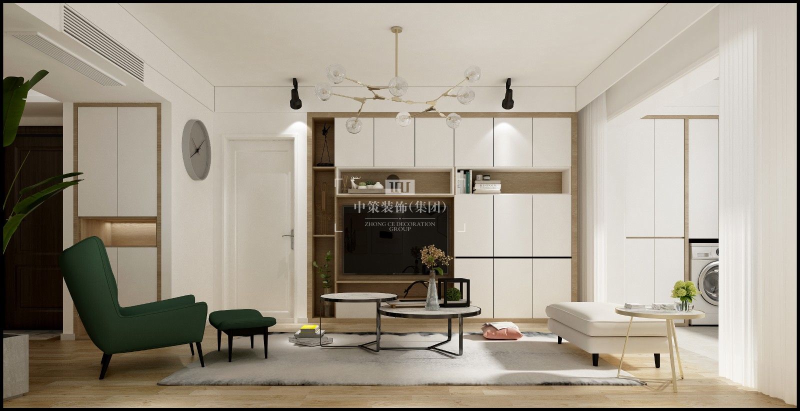 现代北欧风格,白色搭上原木色让整个空间清爽自然,墨绿色作为跳色,让整空间活跃起来