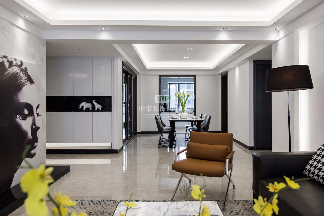 (1)本案以简化的设计理念勾画出现代风格的独特空间效果,将简洁与质感紧密融合,相互贯通。整个空间以黑白色为主橘色为辅,搭配质感家具、个性配饰,打造出简洁而优雅的的生活空间。