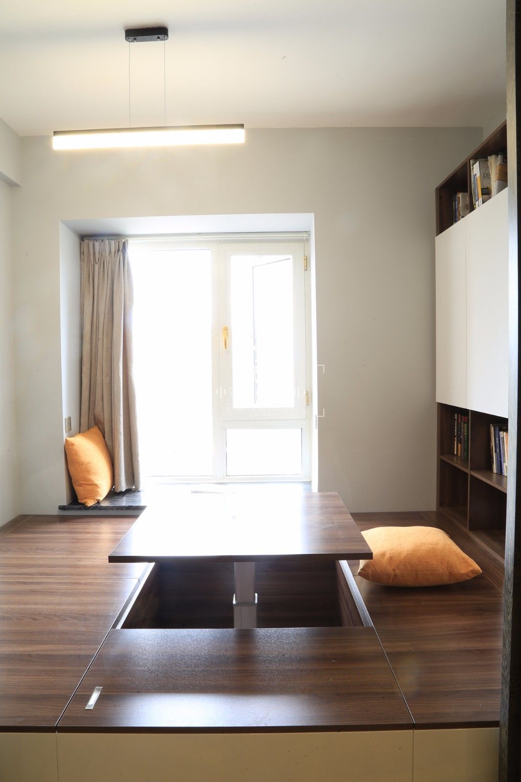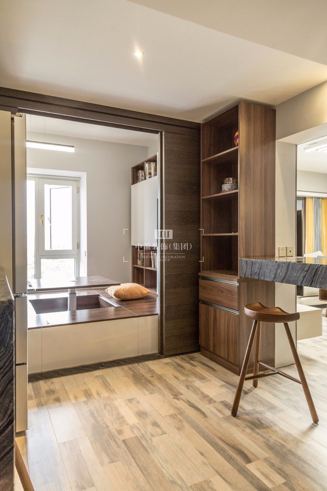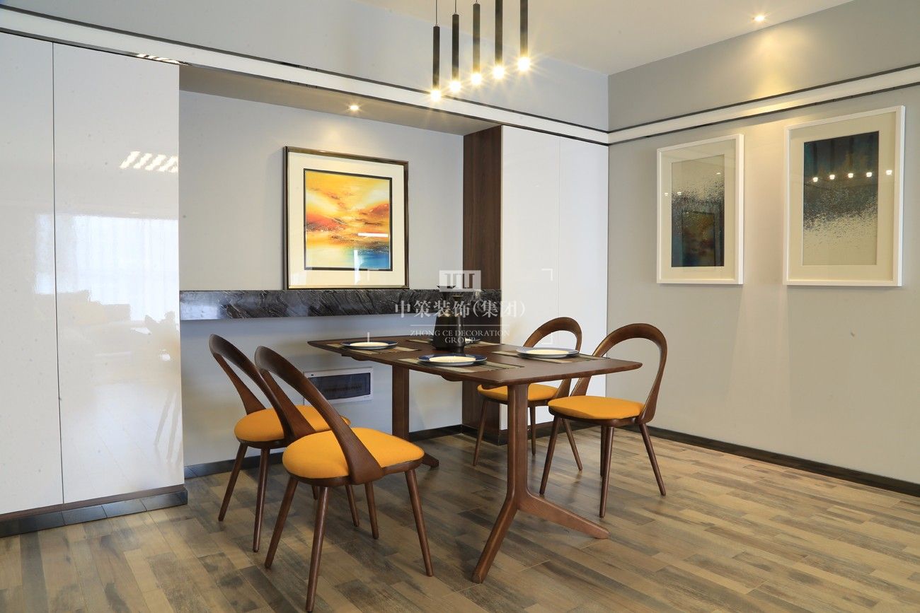 客厅大落地窗户增加了整个房子的光线,每天沐浴着太阳光。客厅和书吧区打通,让整个房间通透,在视觉上增大房间,缩短过道的距离。榻榻米房间的运用,增加活动区域及休息区,推拉门的设计,既方便使用,也可更大的获得自然光线。客厅餐厅夸张的装饰画,表现出墙面的大体量感。明黄色的运用为整个房间增加了活力。干净利落的烤漆白色柜体和黑色石材的对比,经久耐看尔不过时。卧室除去繁琐的配饰,预留必备用品,整体看起来干净尔饱满。