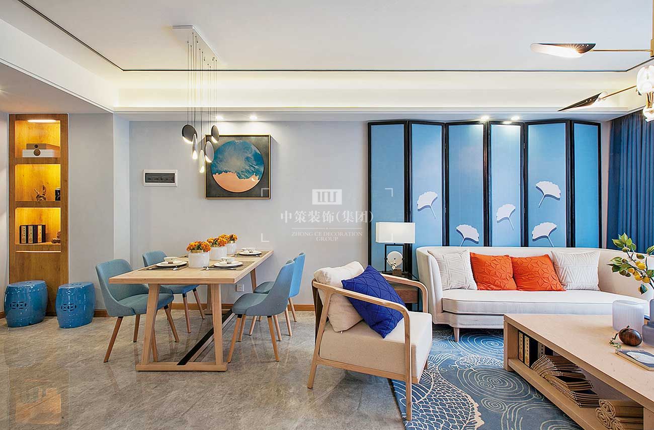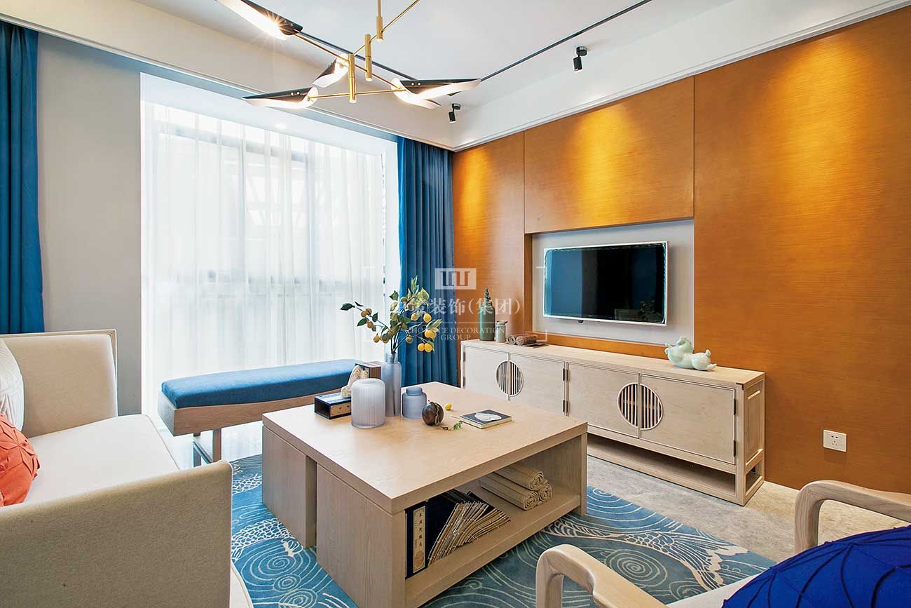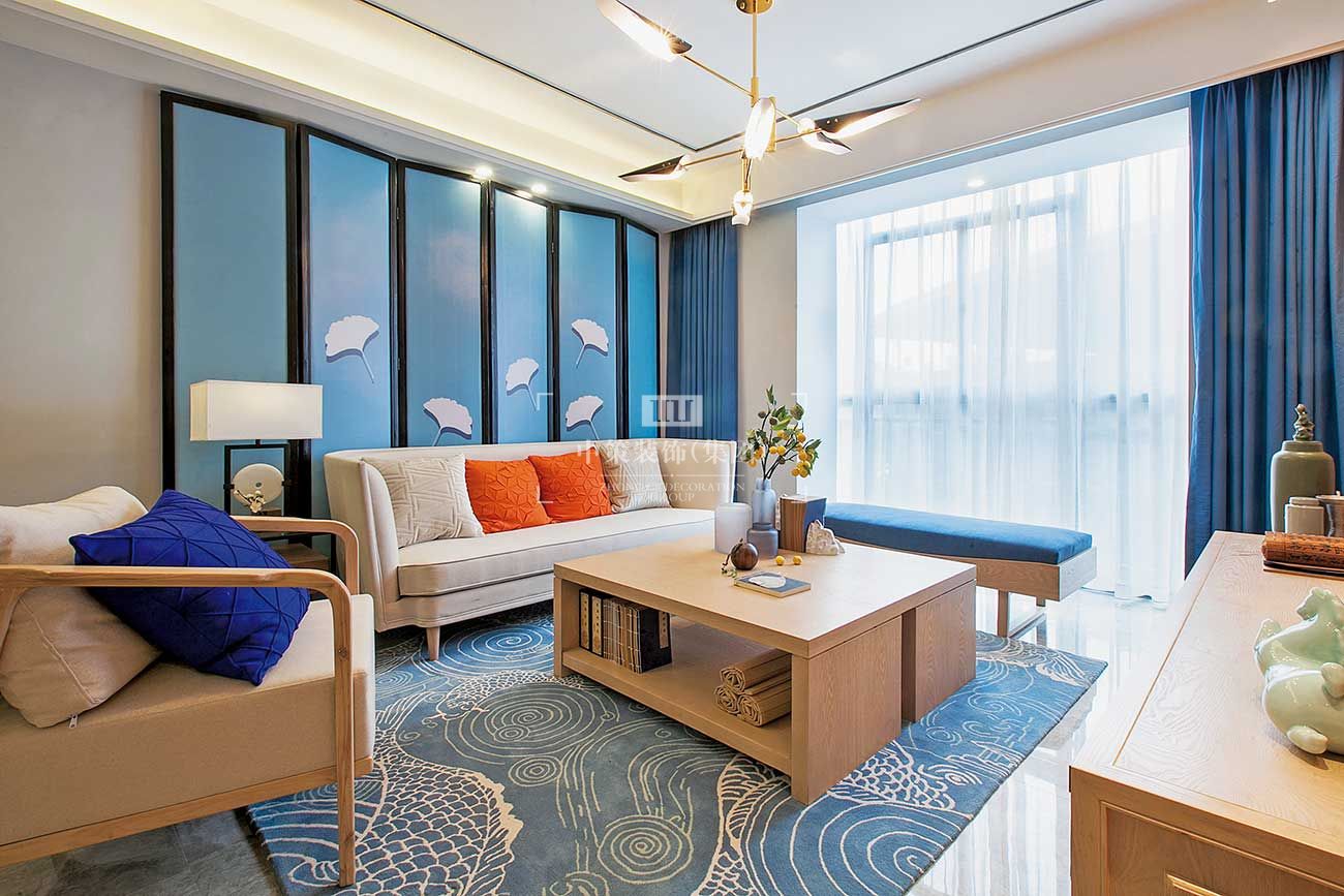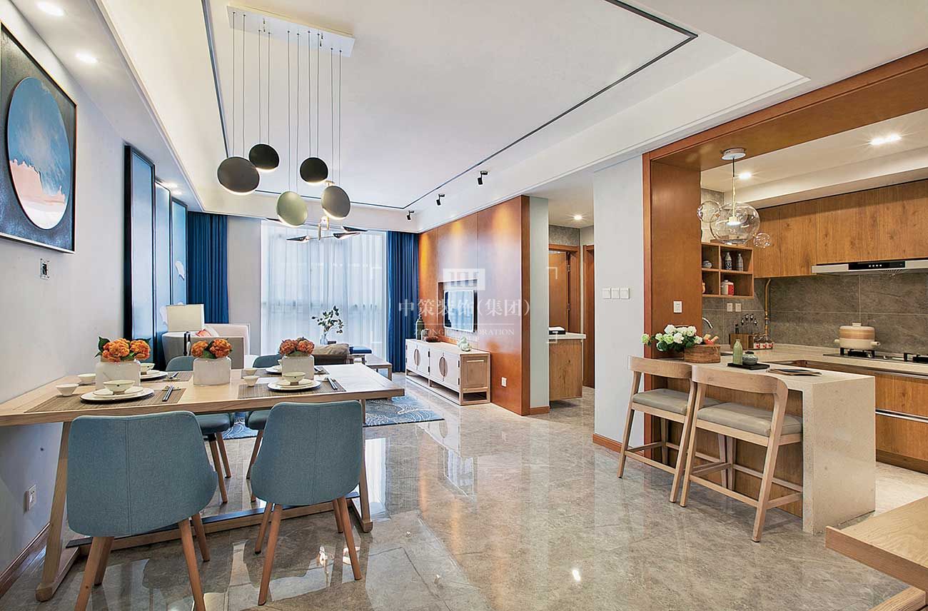 客厅运用冷暖对比的手法凸显沉稳而又不失温馨的感觉,电视墙的木饰面,沙发后面的蓝色屏风和吊顶的黑钛线条,使空间看起来更有流畅感,搭配不失柔和的布艺沙发又增添了生活情趣。开放式厨房的设计,既增加了与家人的互动又充分展现了空间的立体感。