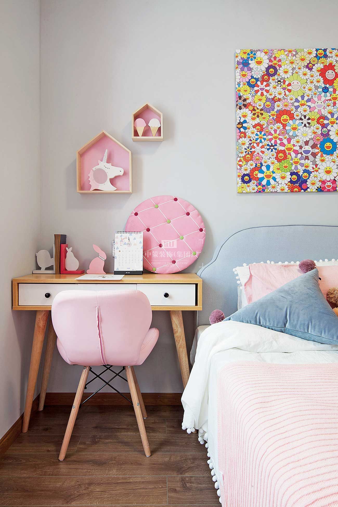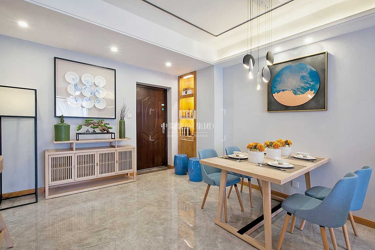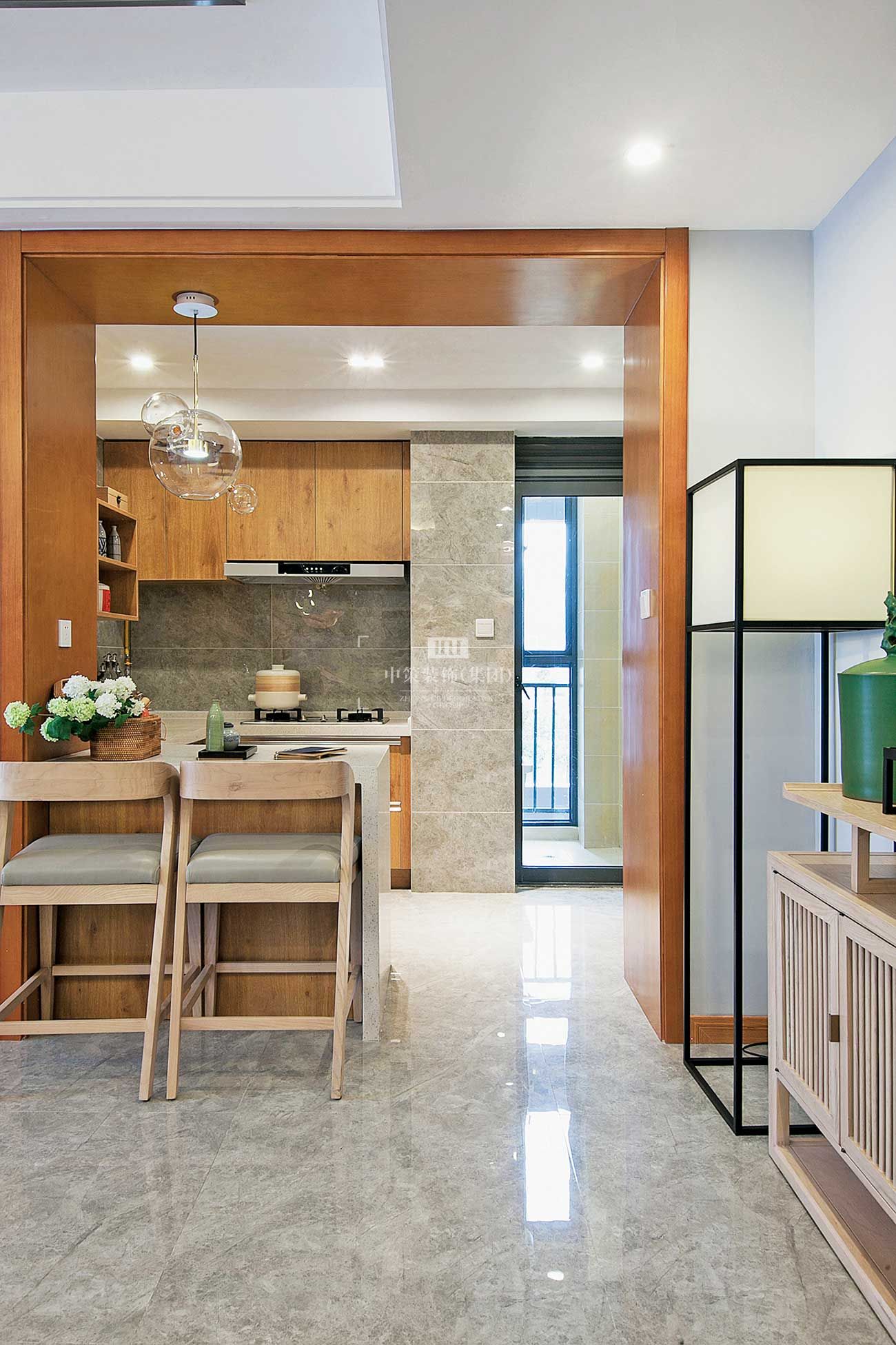 客厅运用冷暖对比的手法凸显沉稳而又不失温馨的感觉,电视墙的木饰面,沙发后面的蓝色屏风和吊顶的黑钛线条,使空间看起来更有流畅感,搭配不失柔和的布艺沙发又增添了生活情趣。开放式厨房的设计,既增加了与家人的互动又充分展现了空间的立体感。