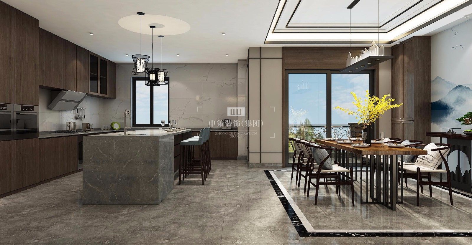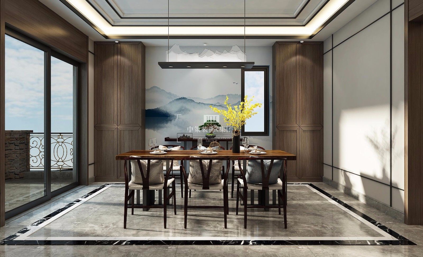 玄关贯穿餐厅与客厅,让空间具有隐蔽性。硬装选用部分木质饰面、大面积布艺硬包、山水画、黑色不锈钢等物料。客厅稳重简约的中式家具,造景以中式屏风、陶瓶盆景,将禅风流淌于新中式空间。