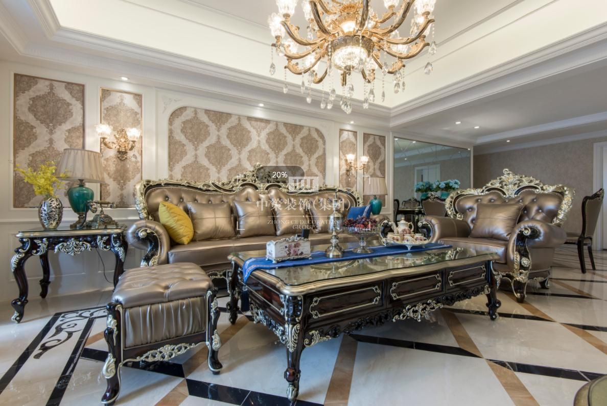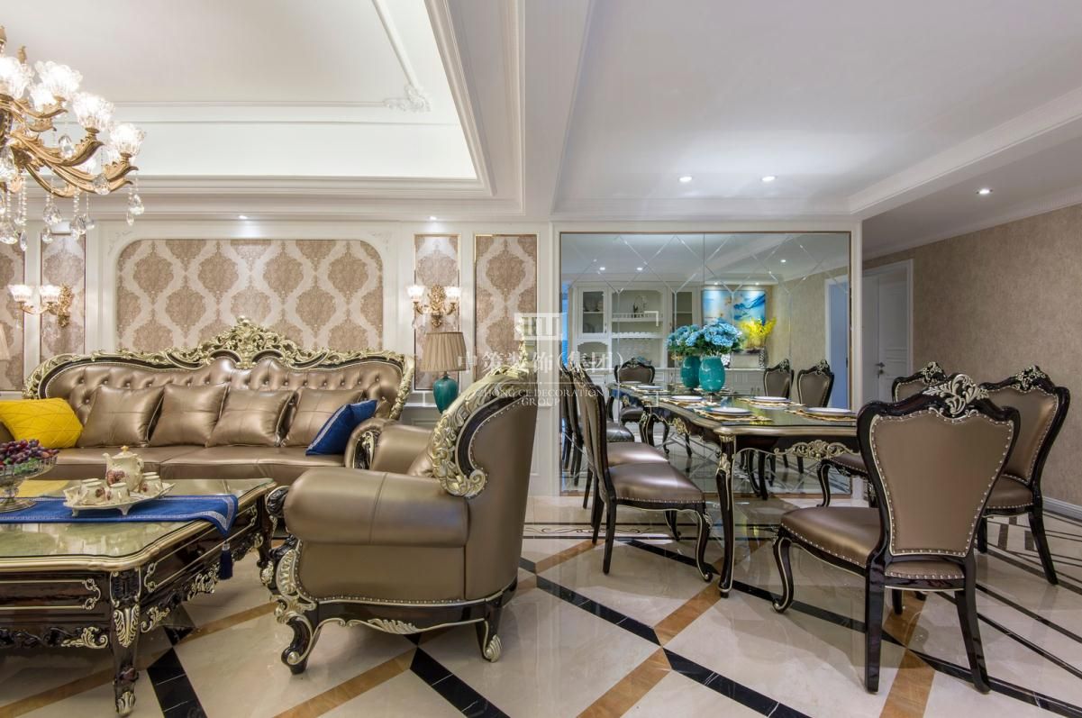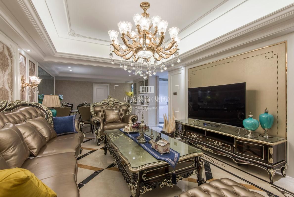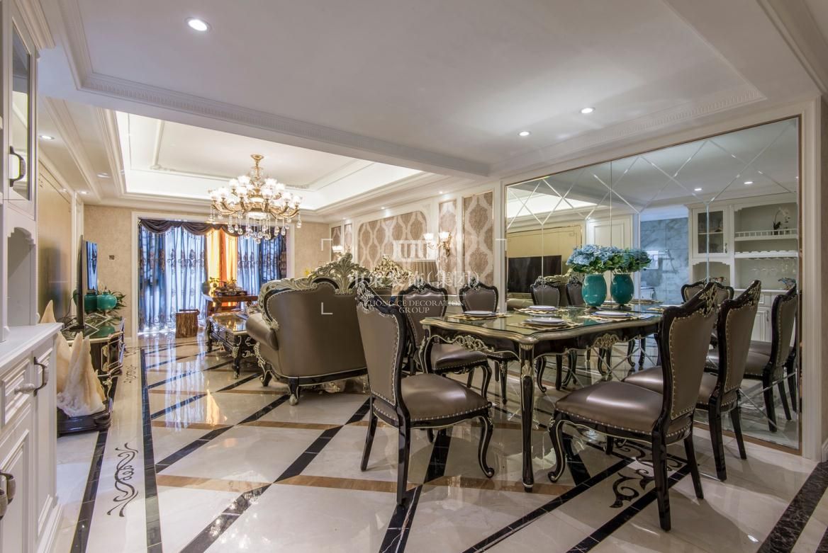 整体暖色墙面肌理感丰富,搭配宫廷品牌家具,整个环境氛围凝聚优雅气质,像是在海洋和天空中手捧一簇盛开的香槟玫瑰。配合深蓝色与暖黄色的靠垫,显眼的撞色对比,既强烈而又和谐,一柔一刚,更生动的体现出家具不一样的轮廓曲线,汇聚出动人风情。