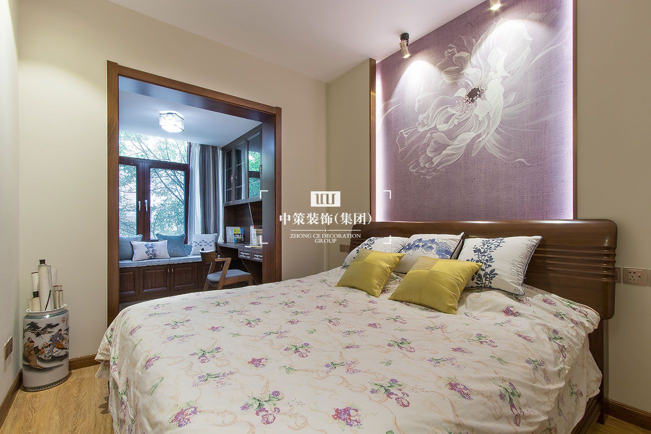 在主卧室的设计上,把书房纳入其中,追求的是简单实用。咖色素雅的色调,白色、蓝色的抱枕装点空间的精致,简洁古朴的中式家具营造出静谧的读书空间。