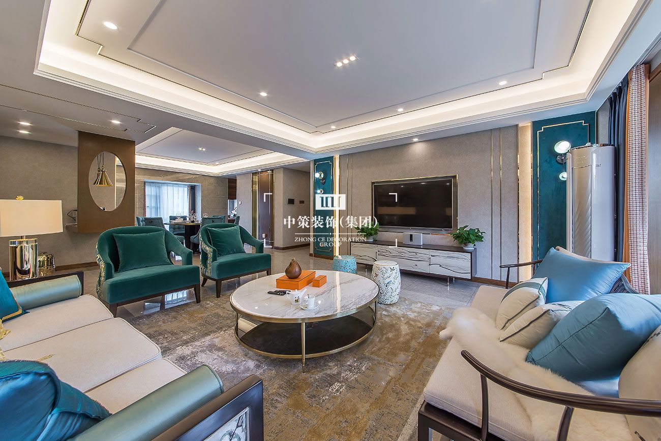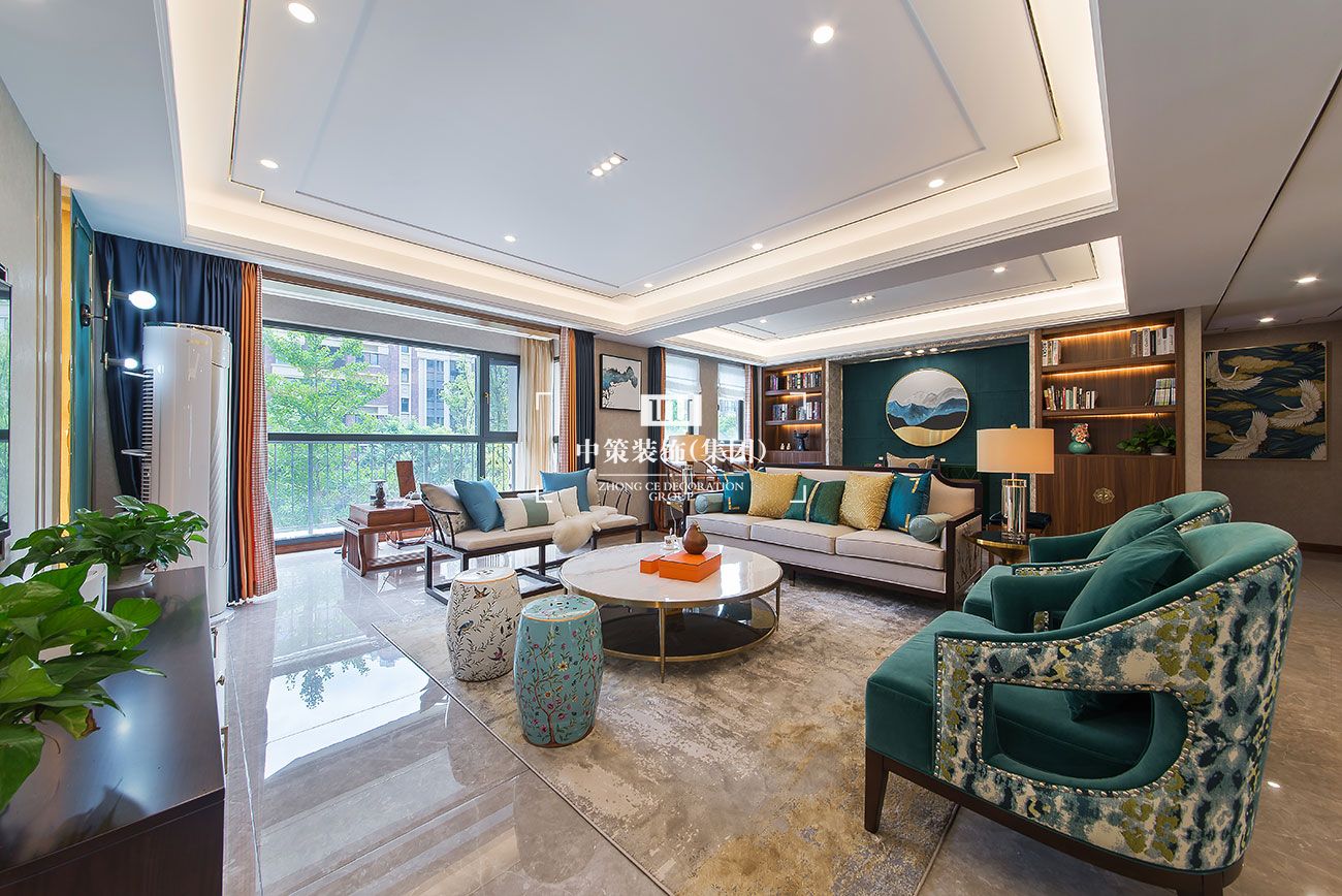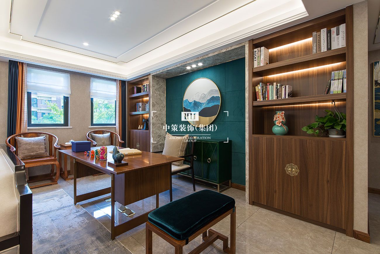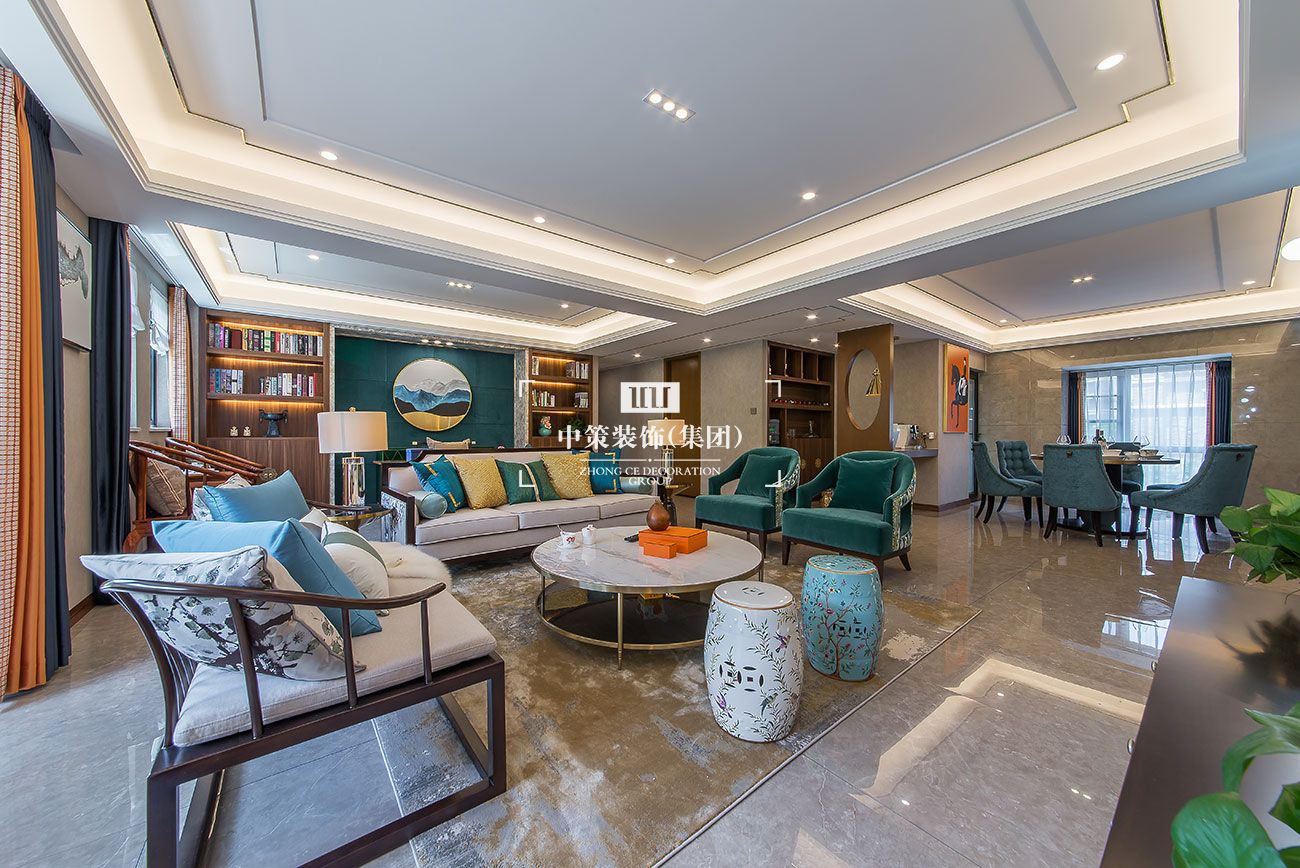 户型上的改动,将原有的界限打开,利用线条与色彩重新划分,定义彼此,也让空间更大气。设计师将原来的客房和卫生间打开,让客厅、书房、餐厅、吧台形成一个通透的大空间。连客厅的电视柜和沙发靠背都是一幅画,虚实相映之间,意境相融之时,一切都被润泽得恰到好处。而开放式书房更显大气通透,一剪窗外光,半响读书时。阳台一张木色的中式茶桌、中式茶椅,与外面花园的天然颜色相衬,闲时端茶落座,别具情趣。